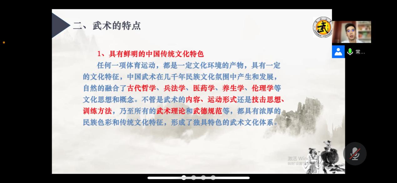 9月1日下午,第一堂课在线上进行。张云飞、常志昭两位老师给学生介绍了武术的基本知识,包括中国武术的起源、发展、特点、拳种与器械等,展现了中国武术文化的博大精深,还专门介绍了澳门37000Cm威尼斯的武术传承和武术精神。